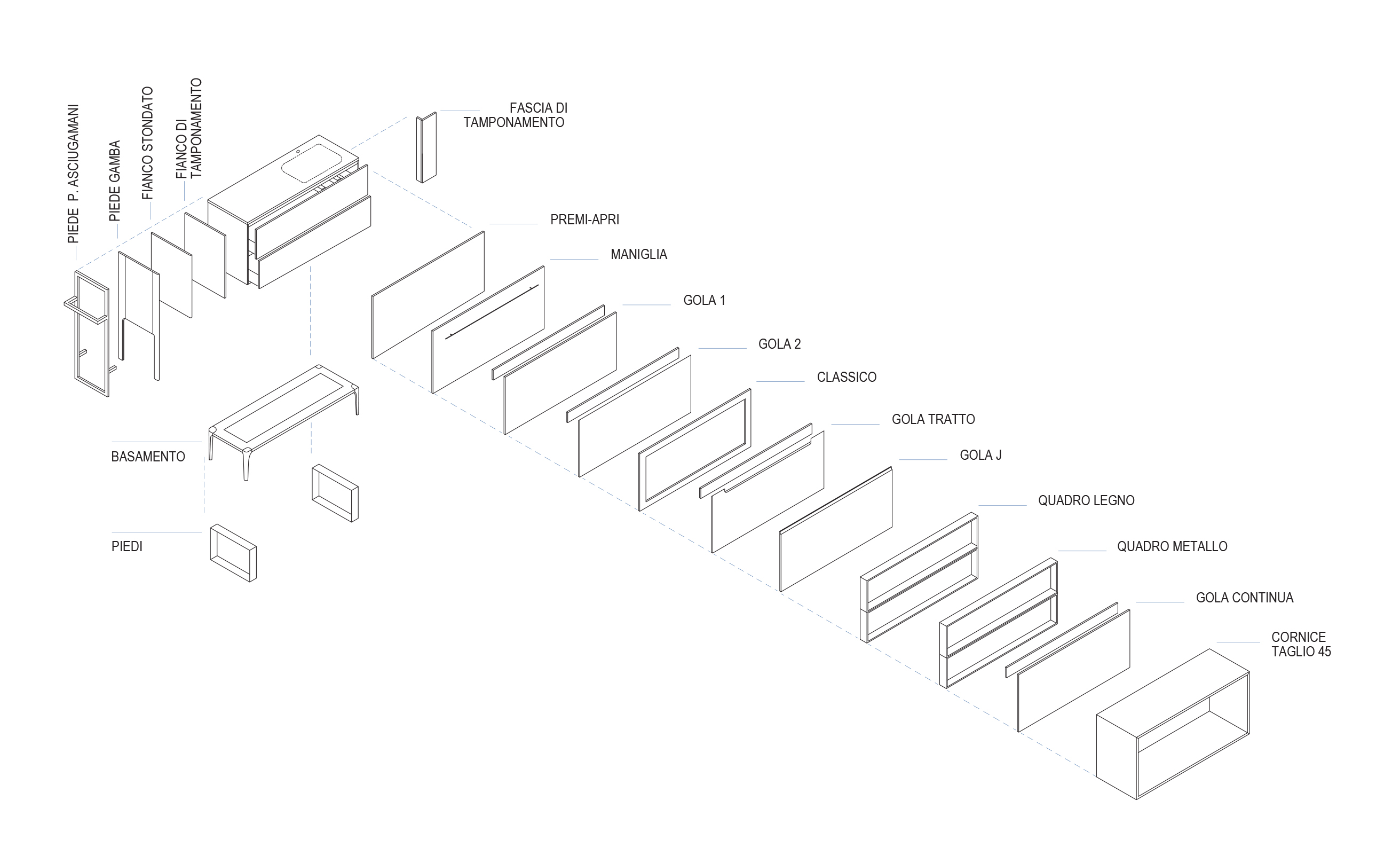 delle dimensioni prima di tutto, ma anche dei modelli, dei materiali, degli elementi, delle finiture, degli accessori, delle attrezzature. Le collezioni si sviluppano intorno ai moduli base adattabili in altezza, larghezza e profondità.
