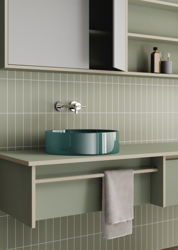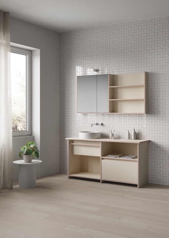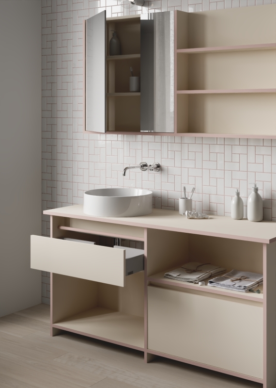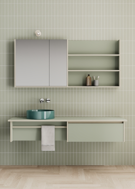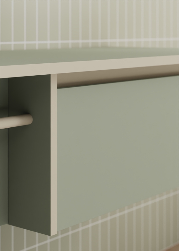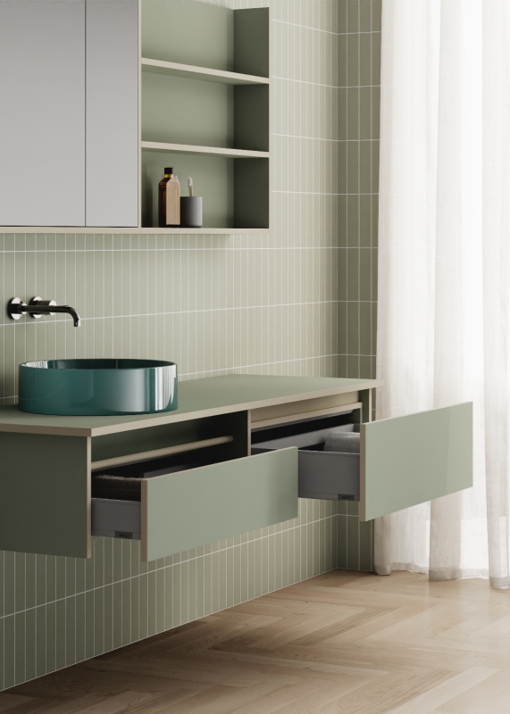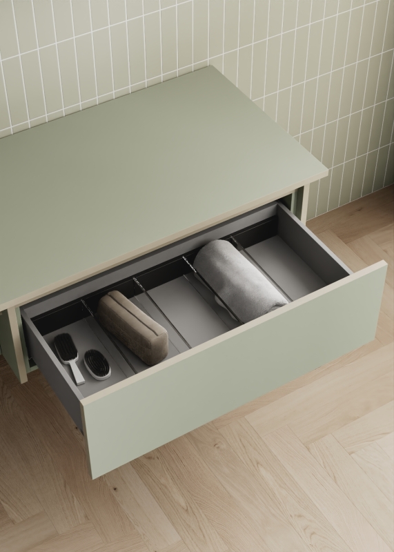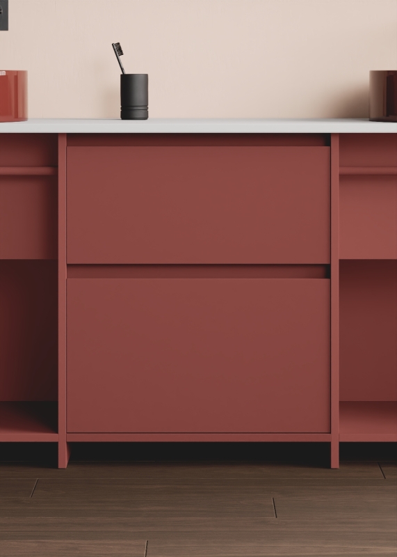 Nella configurazione a terra, Elementare assume un carattere compatto ma leggero grazie allo zoccolo rientrato, che crea un raffinato effetto sospeso. La versione sospesa accentua ancora di più la purezza dei volumi e la precisione delle proporzioni. In entrambe le soluzioni, ogni dettaglio è pensato per coniugare funzione e design: la barra portasalviette, perfettamente integrata, nasconde con discrezione l’apertura del cassetto, trasformando un gesto quotidiano in parte della composizione.