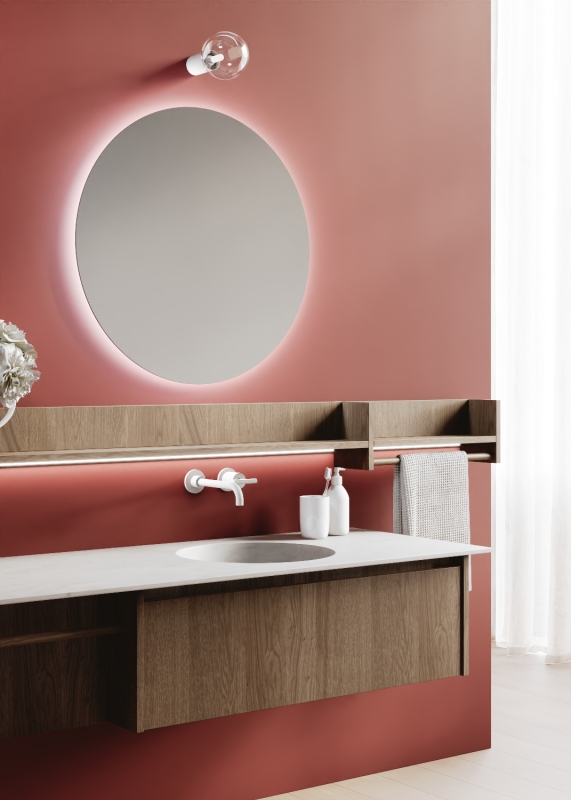 Le finiture Tono, in laminato a tinta unita, si integrano perfettamente con la collezione, ma il progetto può evolvere anche attraverso varianti in laminato, laccato o impiallacciato.