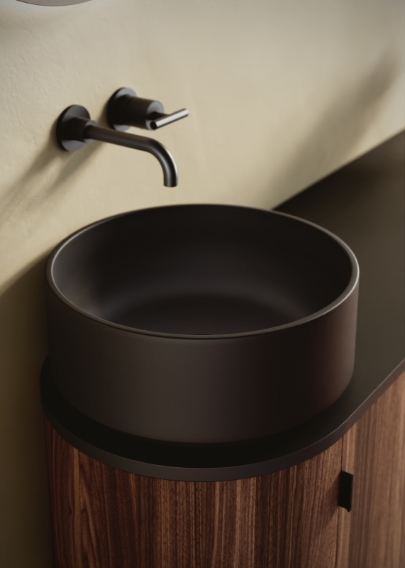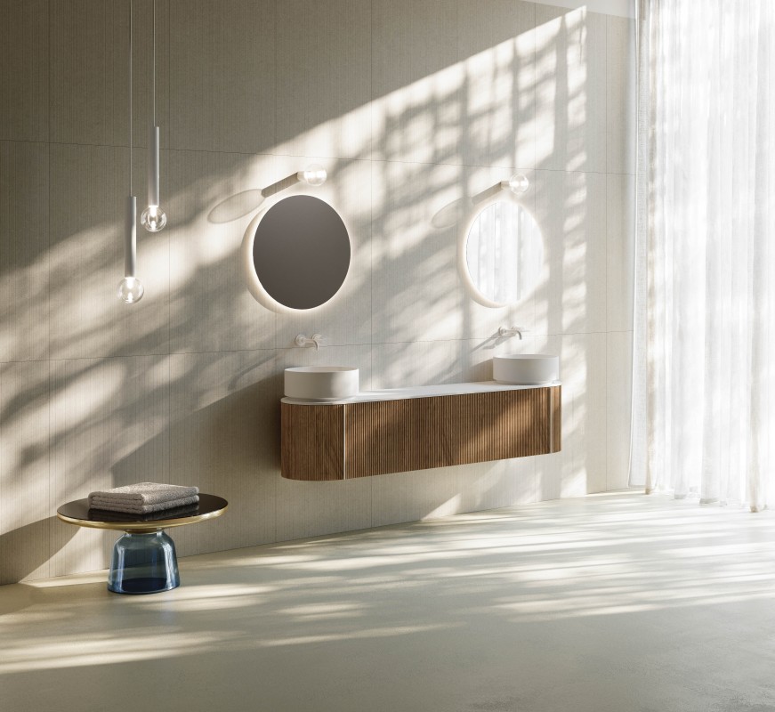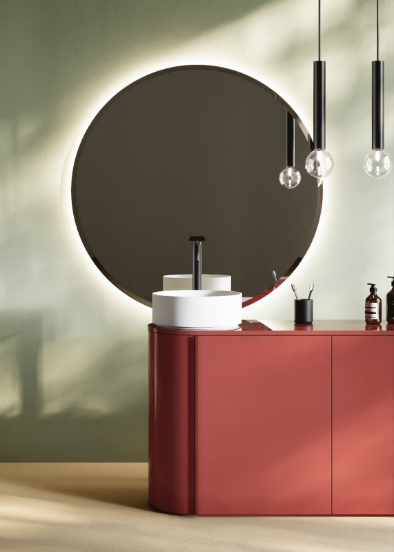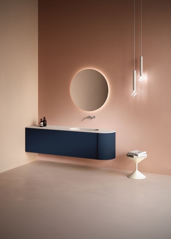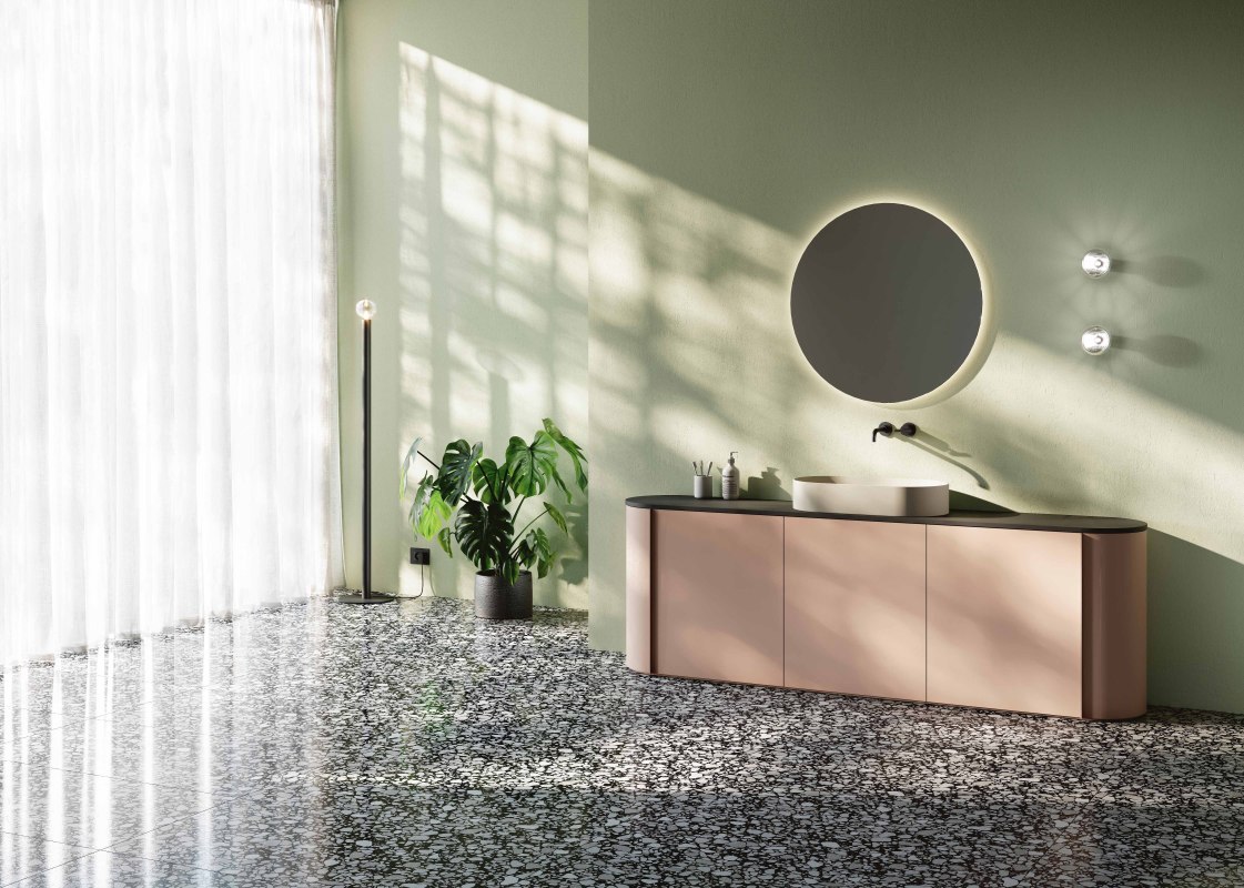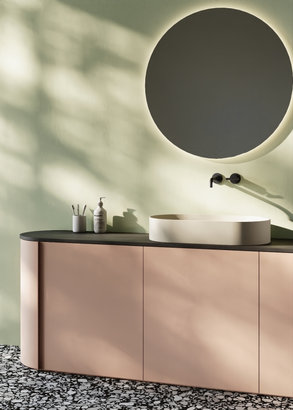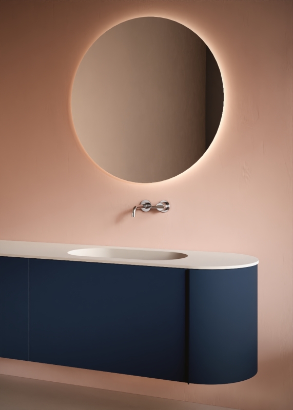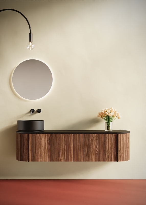 Un modulo semicircolare si integra armoniosamente con le basi lineari, adattandosi naturalmente alle esigenze degli spazi bagno. Combinando moduli lineari con uno o due elementi semicircolari laterali, è possibile creare configurazioni su misura di cassetti e ante, lineari o semicircolari.