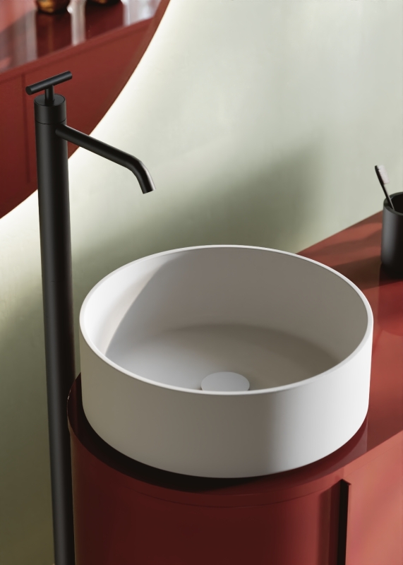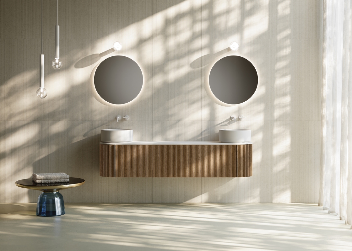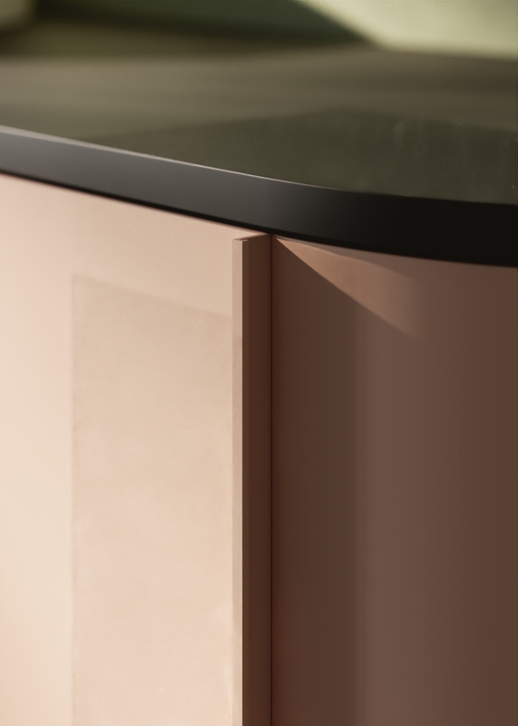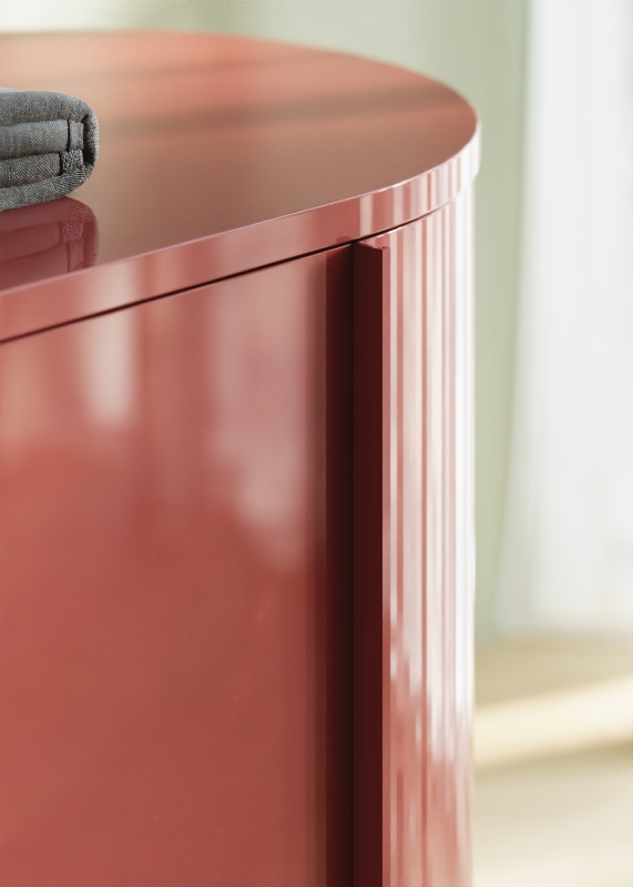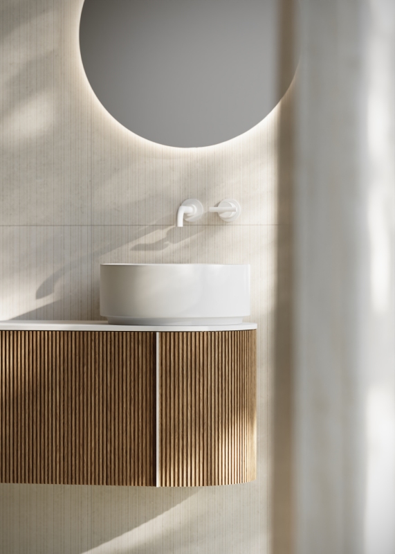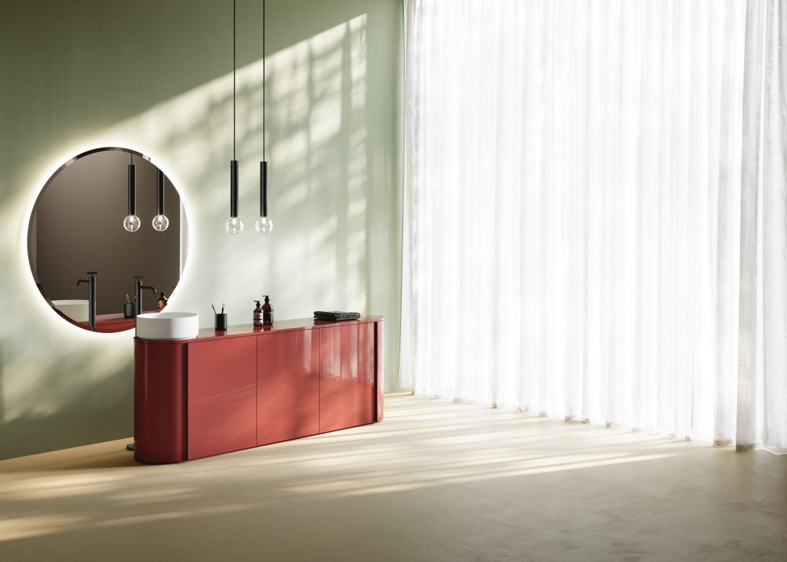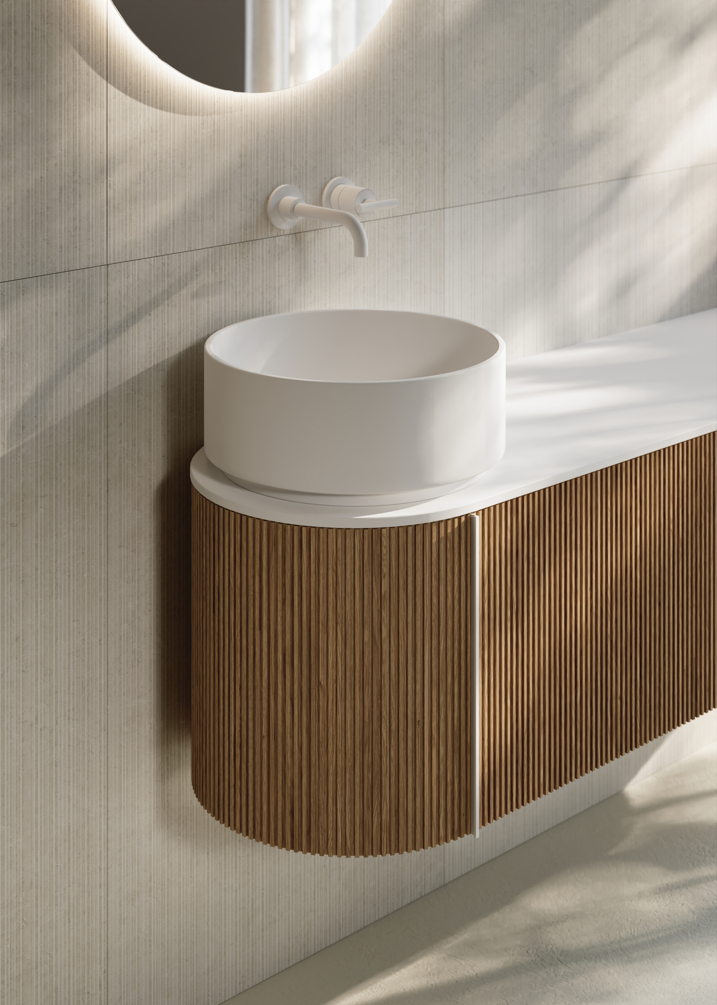 Un modulo semicircolare si integra armoniosamente con le basi lineari, adattandosi naturalmente alle esigenze degli spazi bagno. Combinando moduli lineari con uno o due elementi semicircolari laterali, è possibile creare configurazioni su misura di cassetti e ante, lineari o semicircolari.
