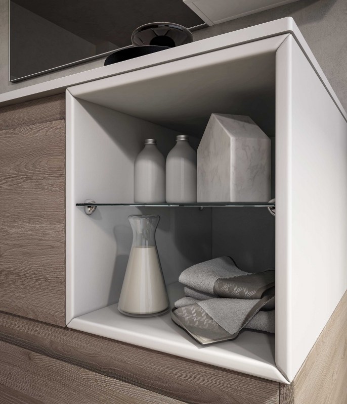 Gola 2 presenta una linea di mobili bagno estremamente funzionale e minimale la cui apertura è caratterizzata da un incavo a gola con angolo a 45 gradi, che sostituisce la classica maniglia.