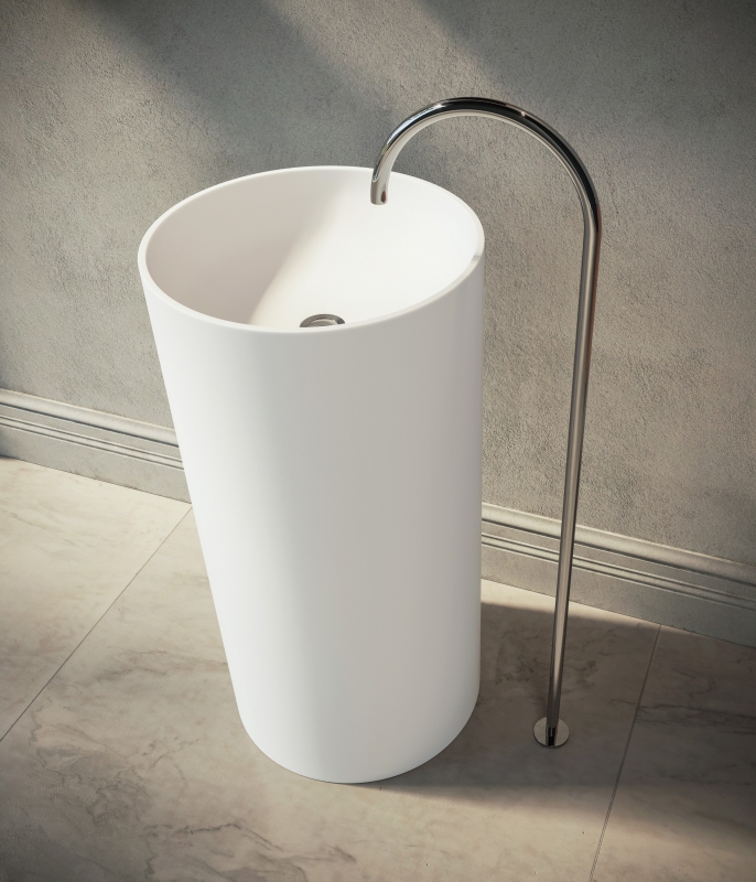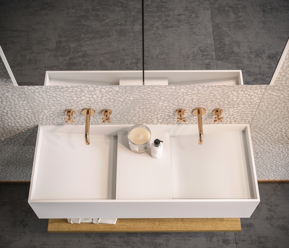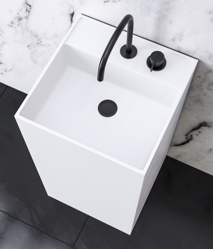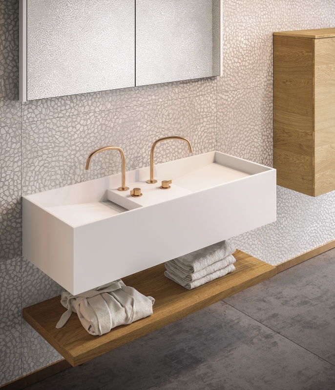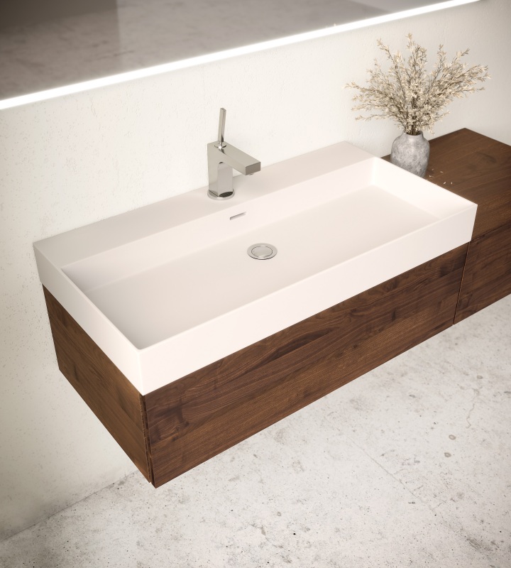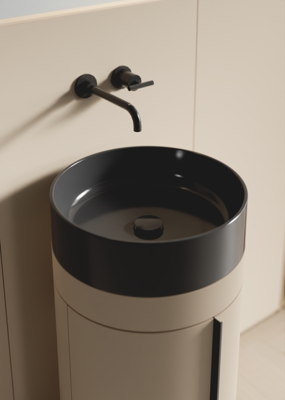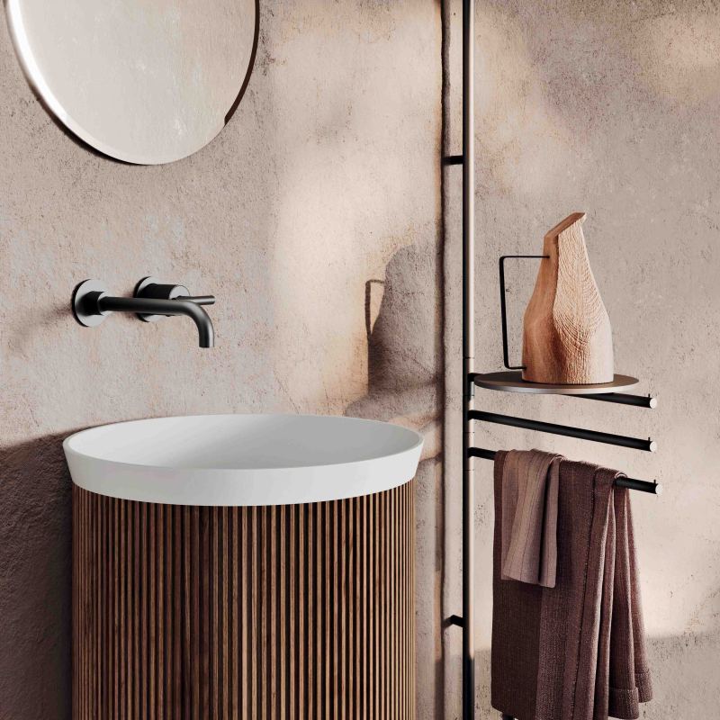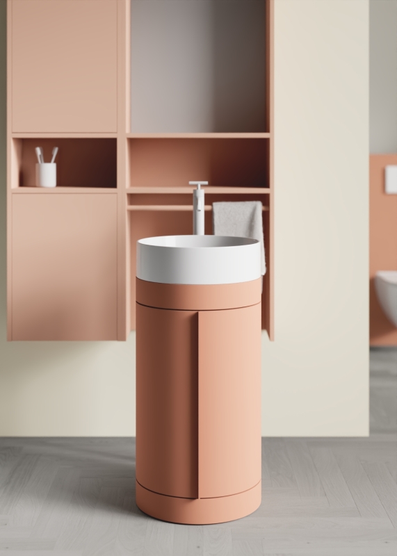 I lavabi sono realizzati in materiale acrilico di colore bianco o in una selezione di colori neutri in finitura opaca.