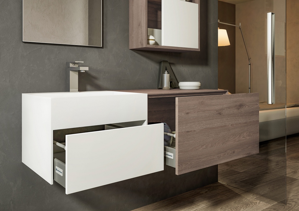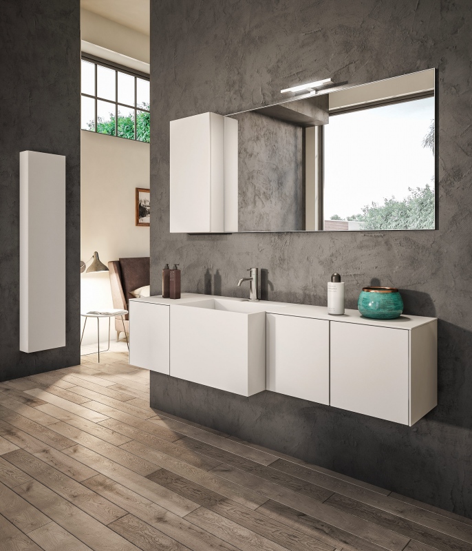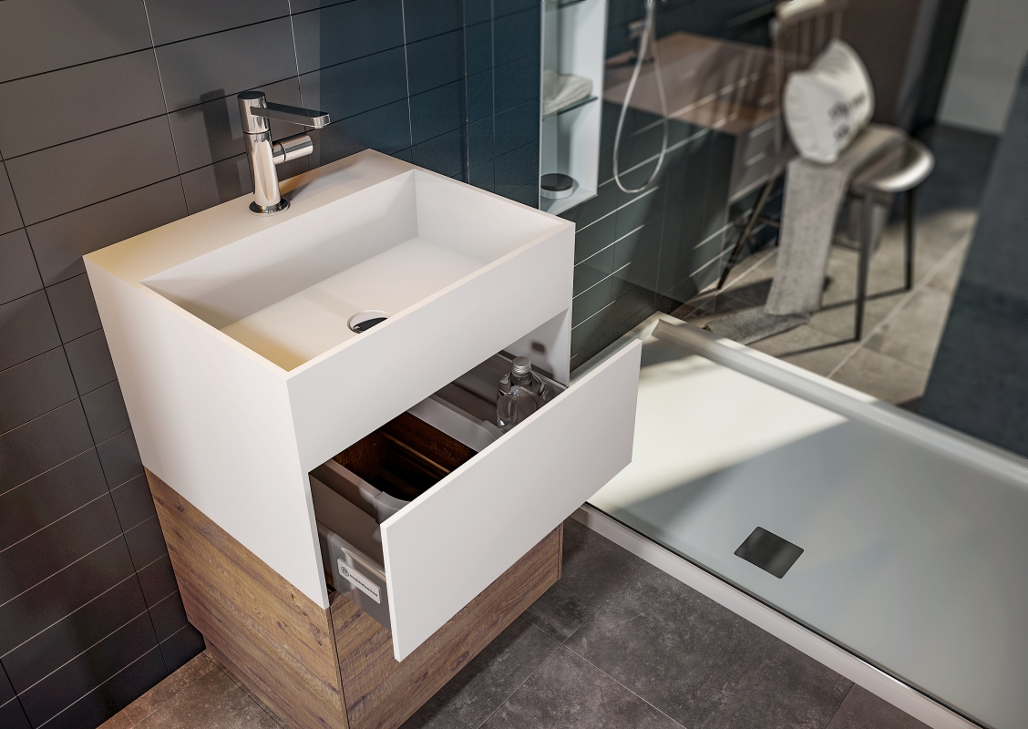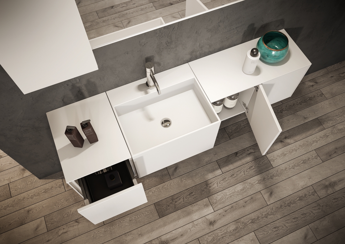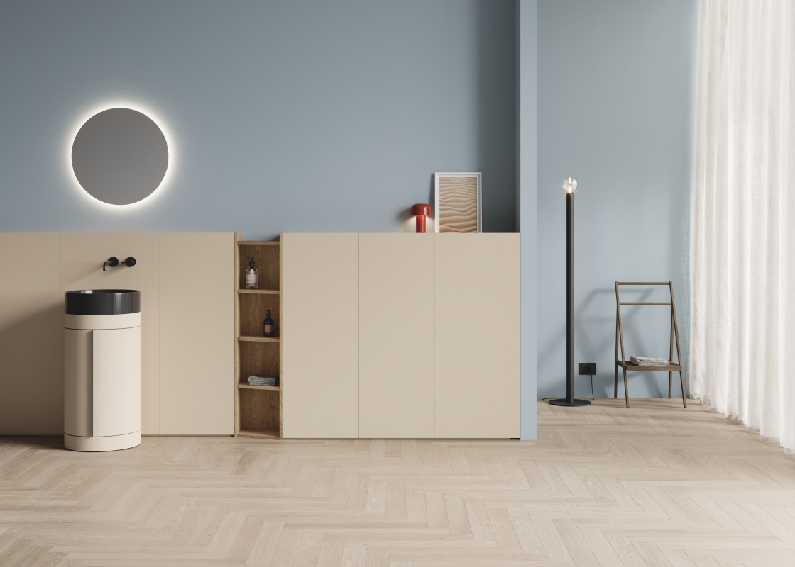 I lavabi sono realizzati in materiale acrilico di colore bianco o in una selezione di colori neutri in finitura opaca.