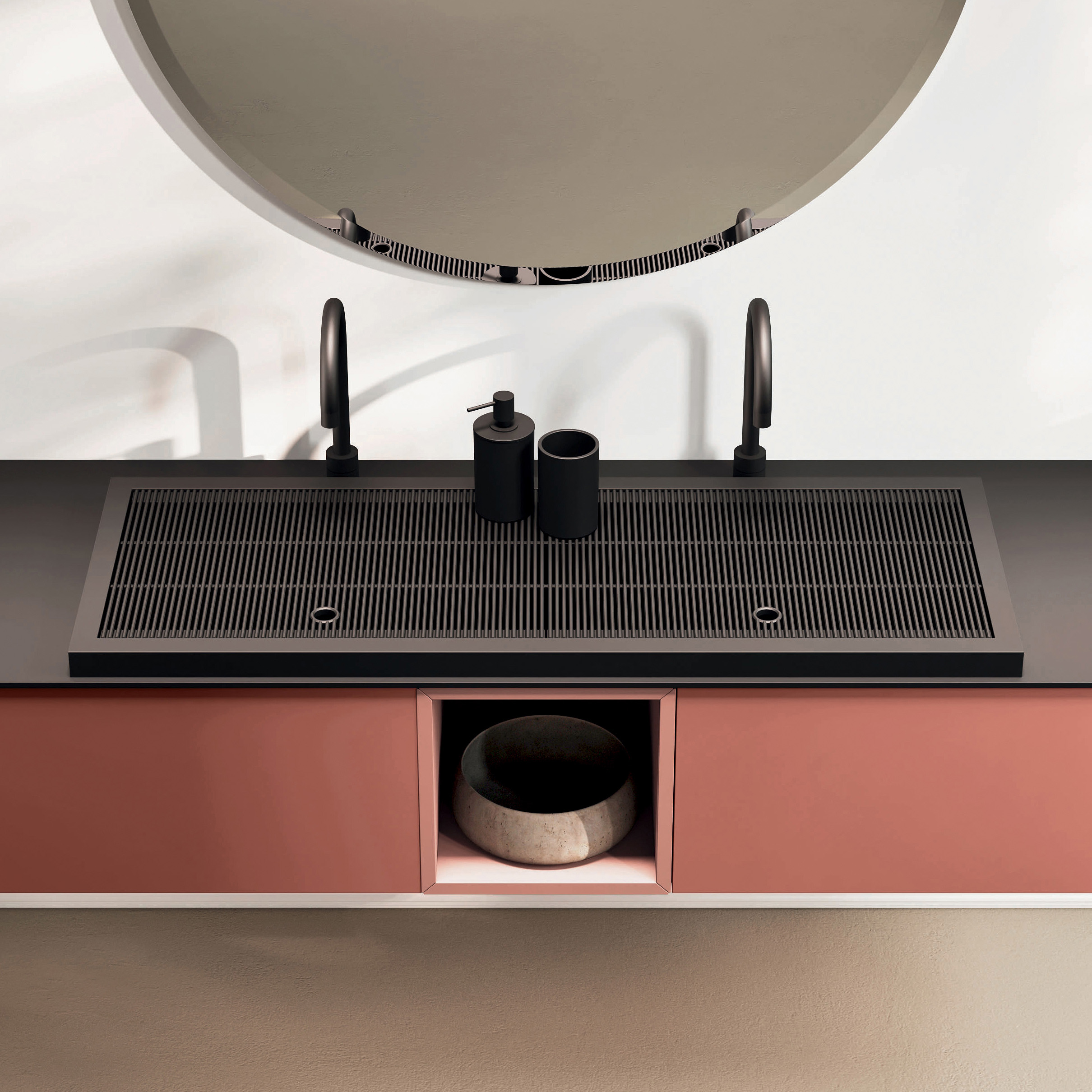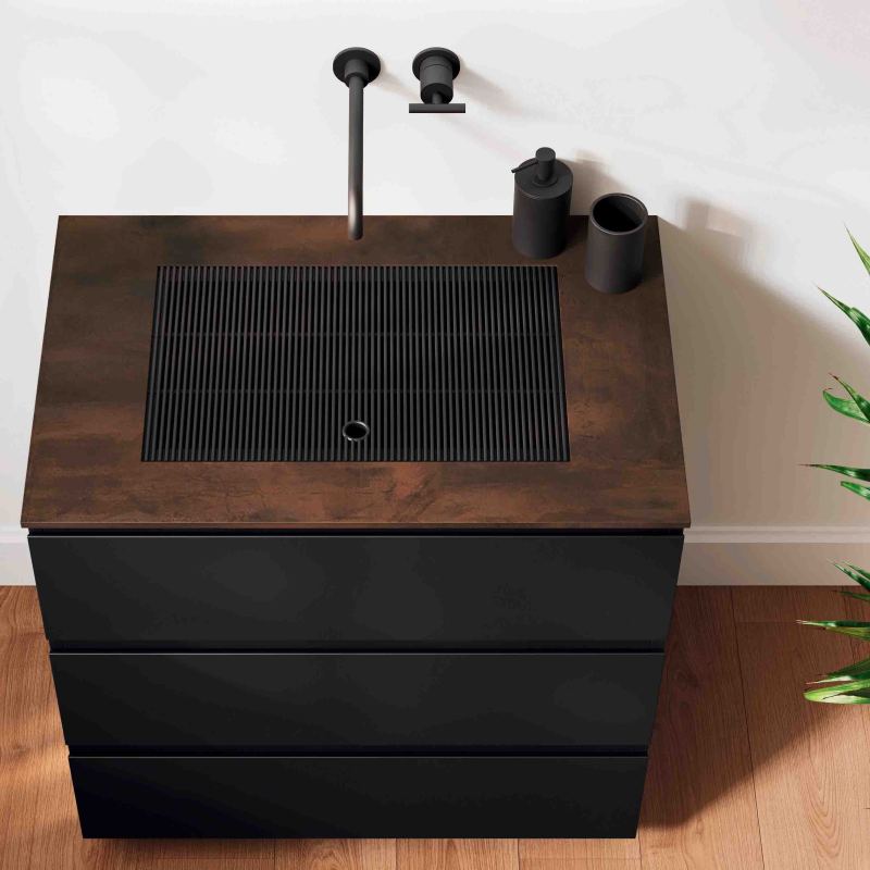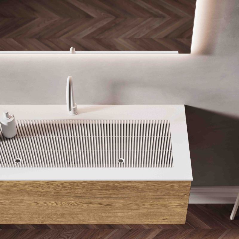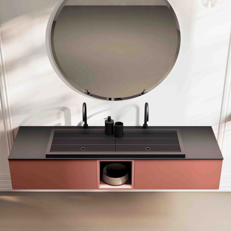 La griglia Noè è un’opzione innovativa progettata per le vasche in ocritech con bordo dritto. Posizionandosi sopra la vasca integrata nel top, funziona come un coperchio che copre la vasca e offre una superficie complanare altamente pratica e funzionale. Questa versatilità consente di appoggiare oggetti e crea un comodo contenitore all’interno della