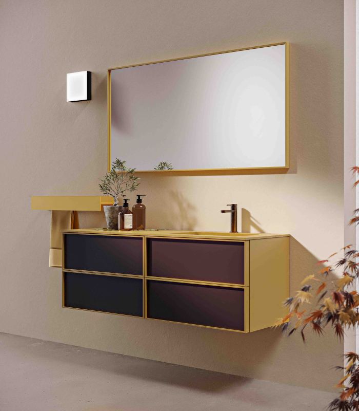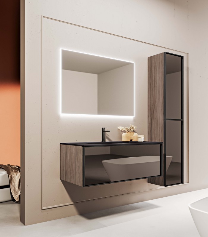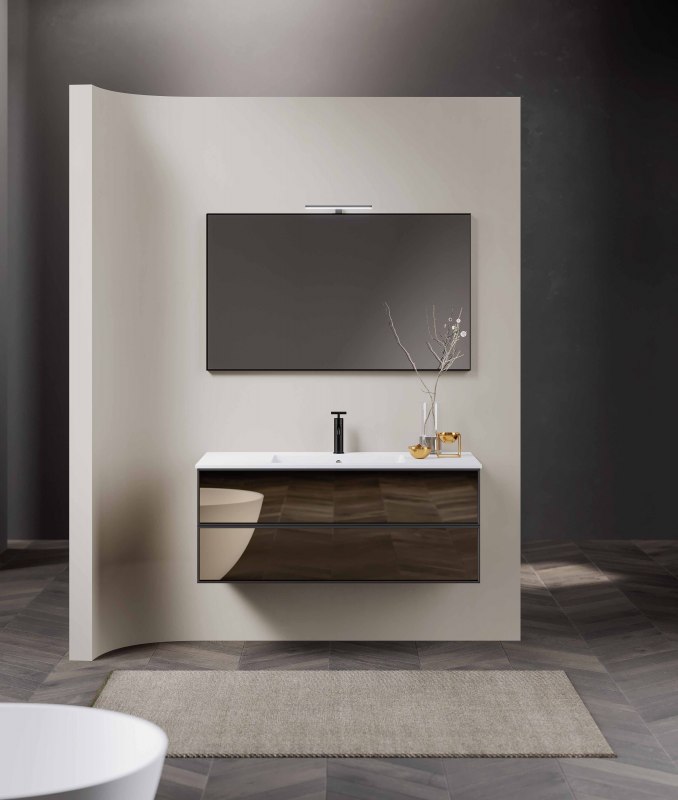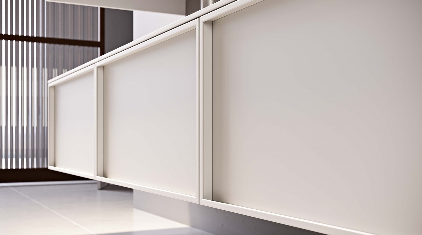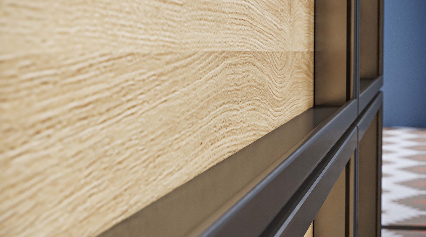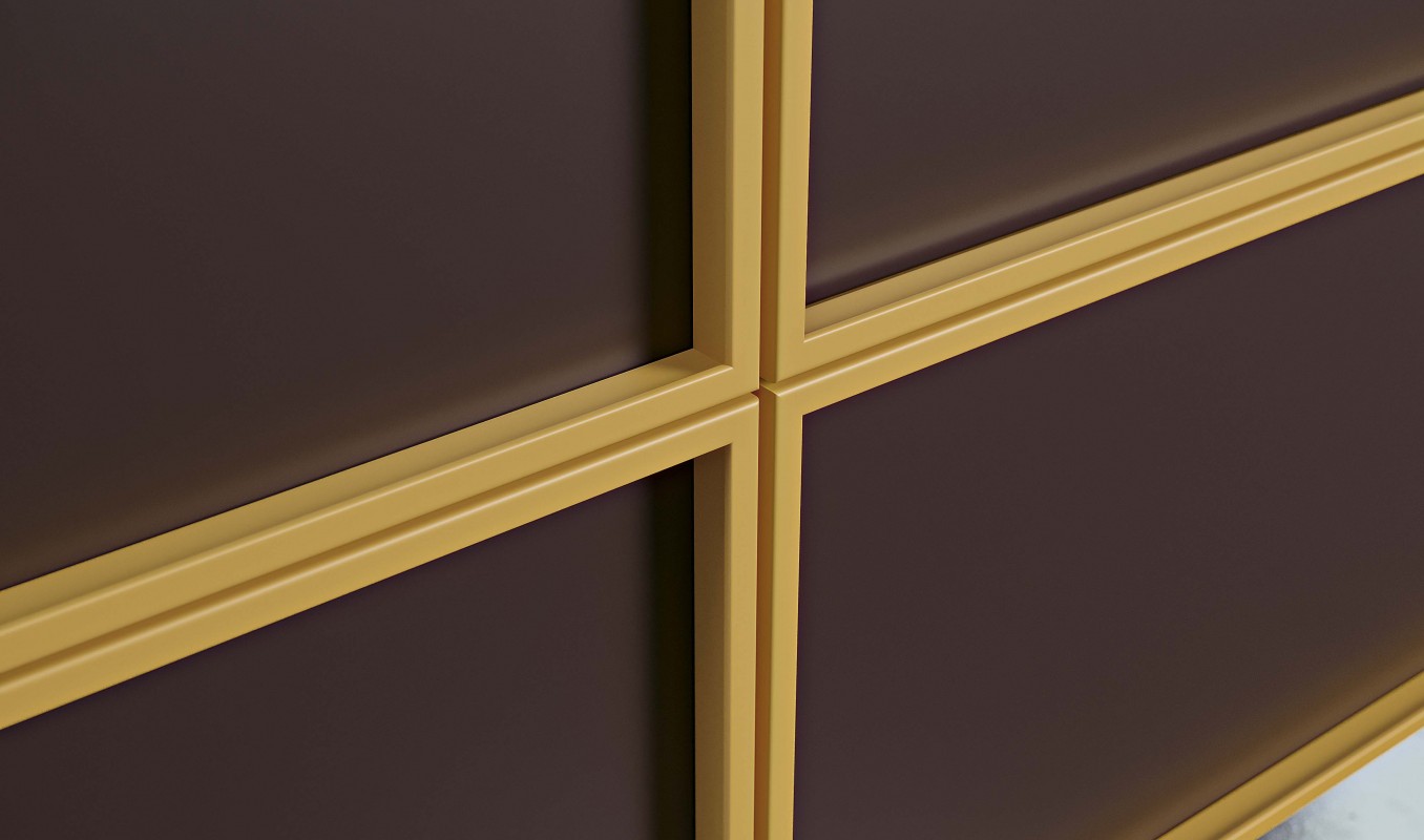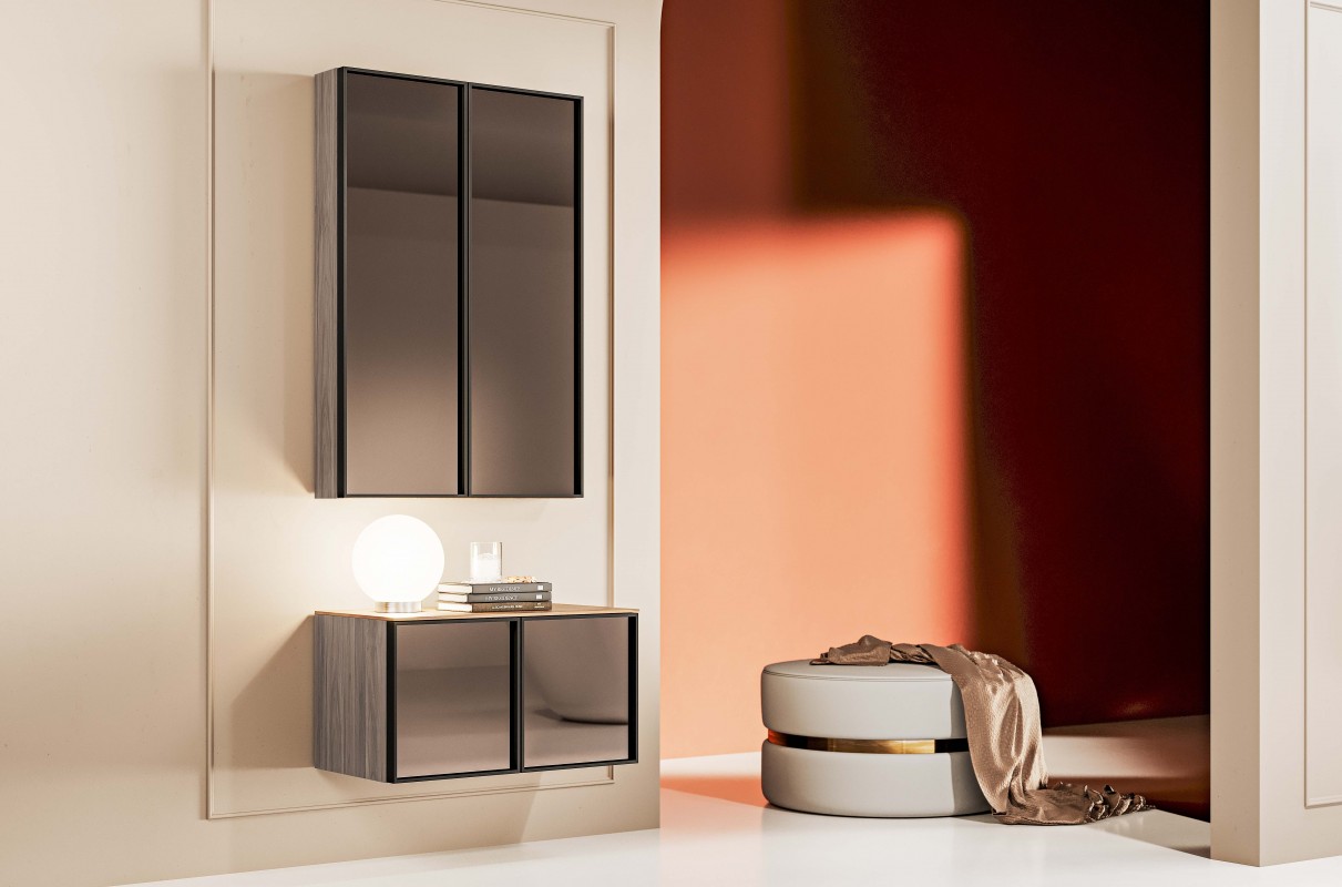 Il telaio metallico laccato opaco ospita una piccola gobba nella parte superiore per facilitare l’apertura. I pannelli dei frontali possono essere a specchio extrachiaro o bronzato, laccati, nelle essenze legno e in massello.