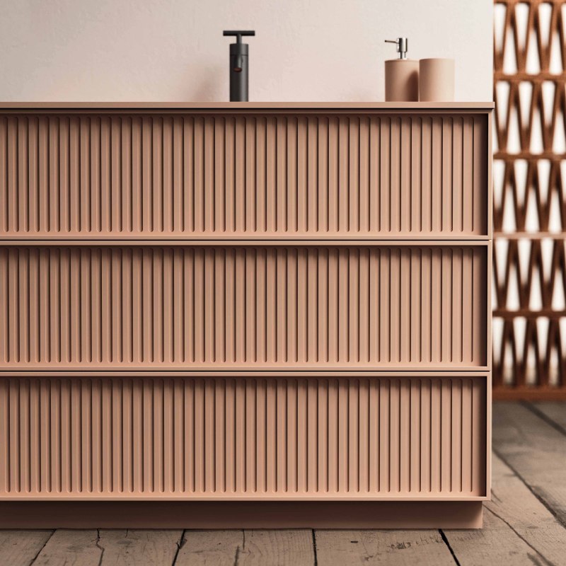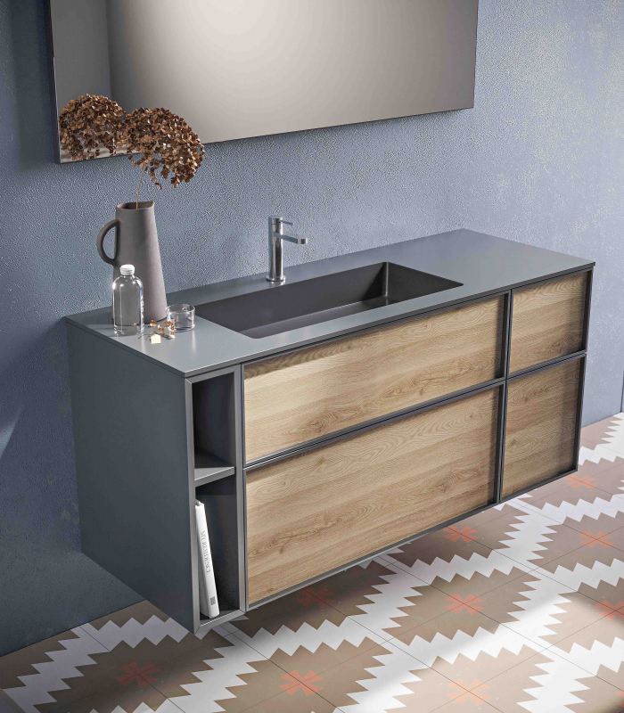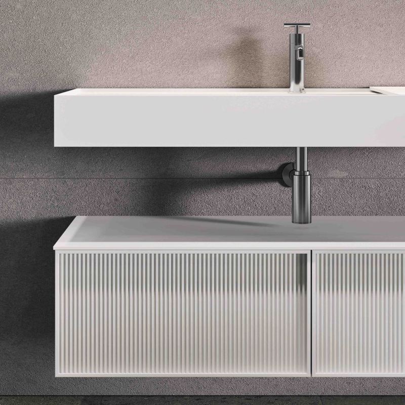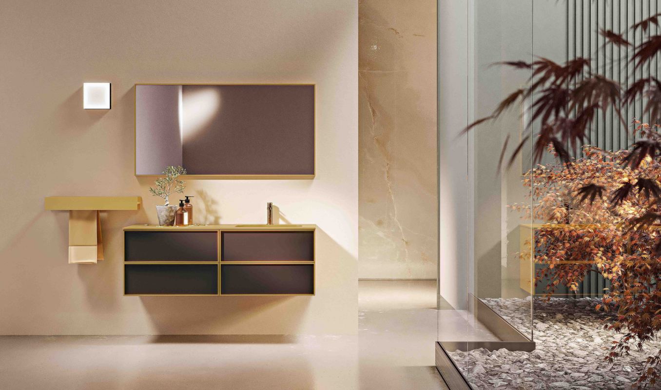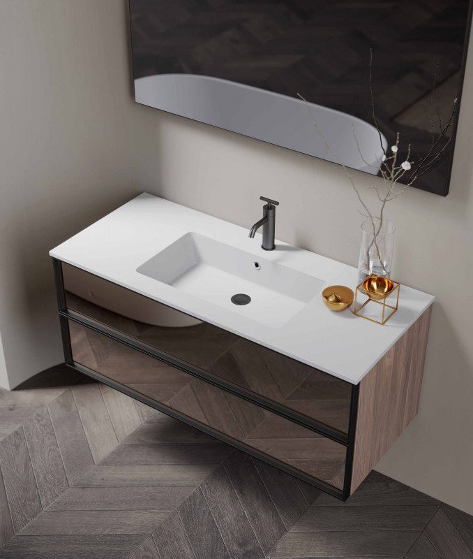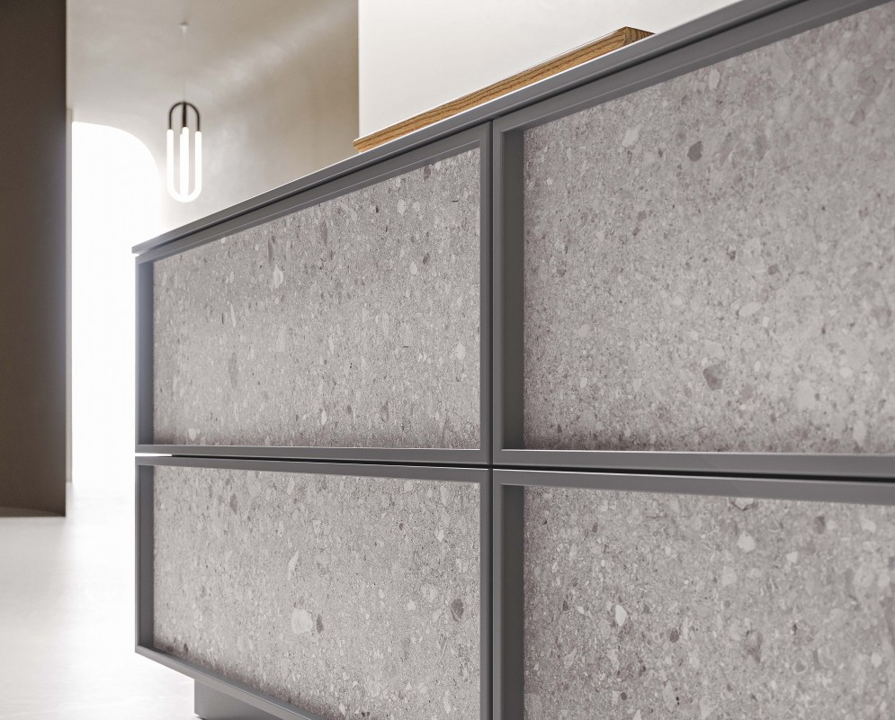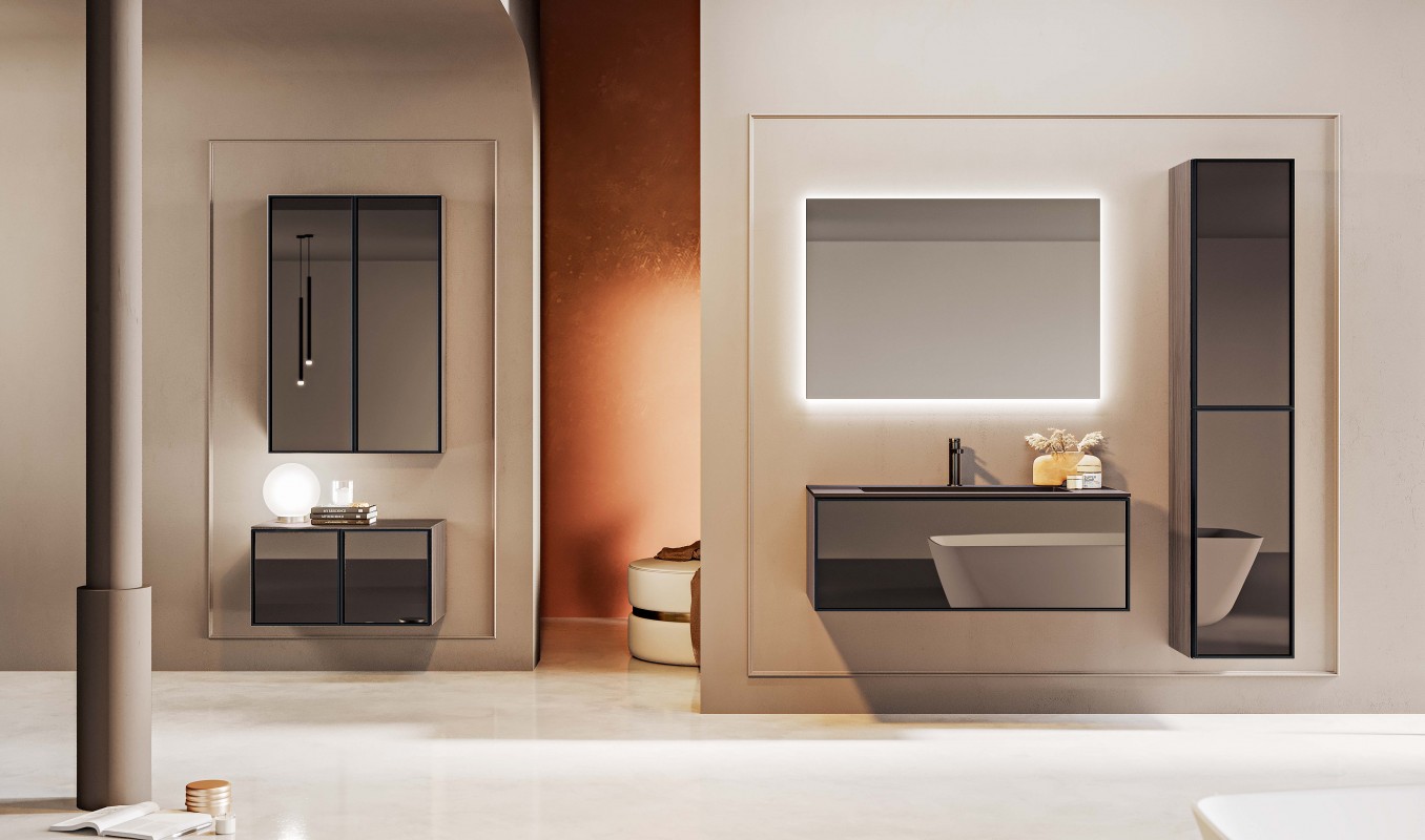 Il telaio metallico laccato opaco ospita una piccola gobba nella parte superiore per facilitare l’apertura. I pannelli dei frontali possono essere a specchio extrachiaro o bronzato, laccati, nelle essenze legno e in massello.