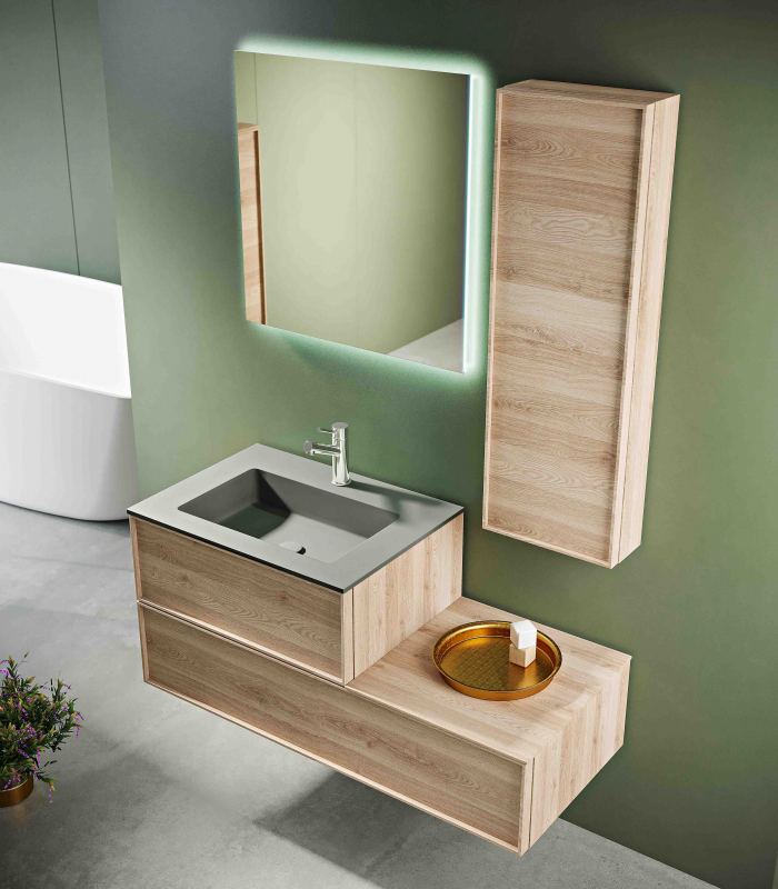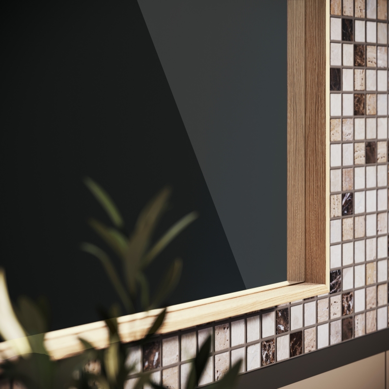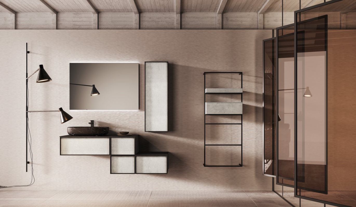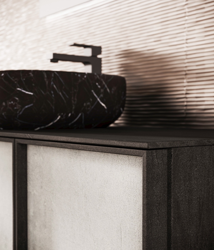 È una collezione componibile nella quale il dettaglio estetico conferisce un risultato di grande impatto visivo sia quando usato nelle basi, sia nei complementi d’arredo: colonne, specchi, vassoi.